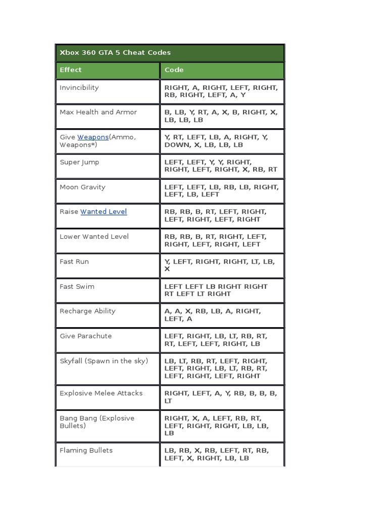 Xbox 360 Gta 5 Cheat Codes Docx