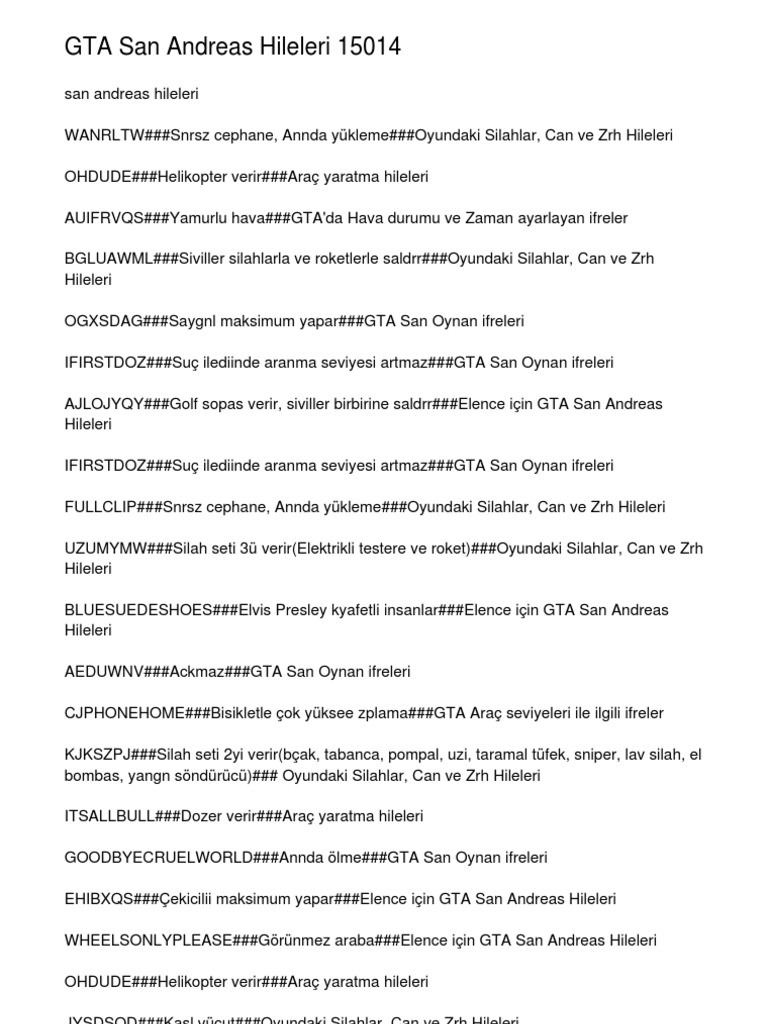 Gta San Andreas Sifreleri Indir Grand Theft Auto Hile Indir
