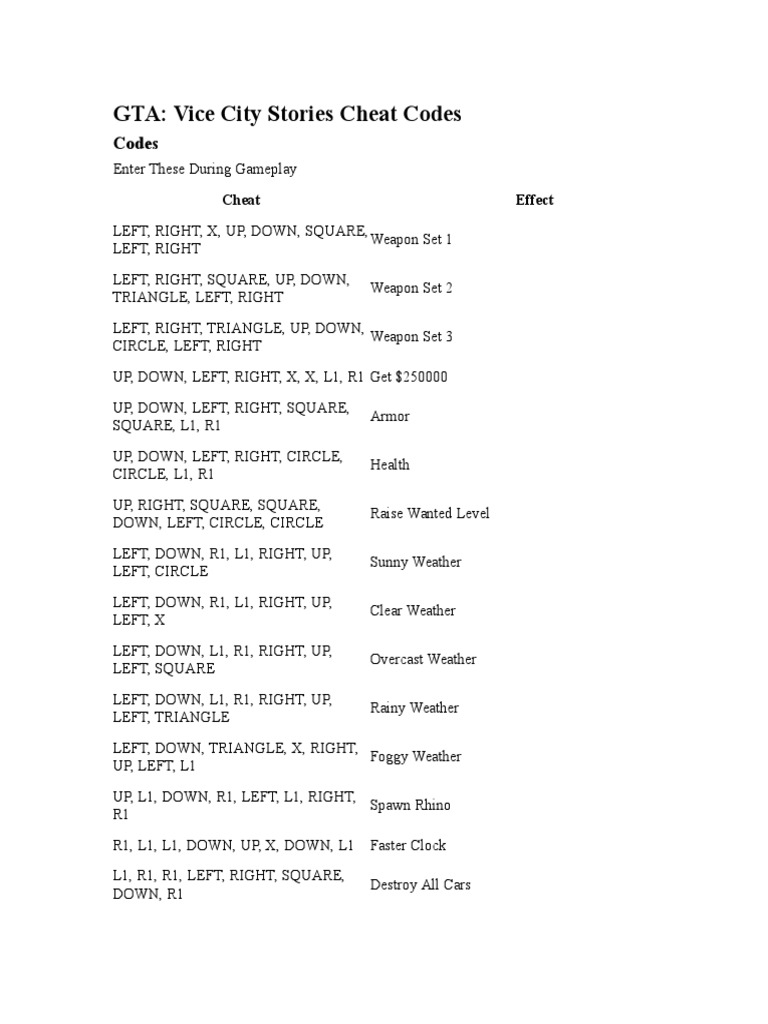 Gta Vice City Cheat Codes For Ps2