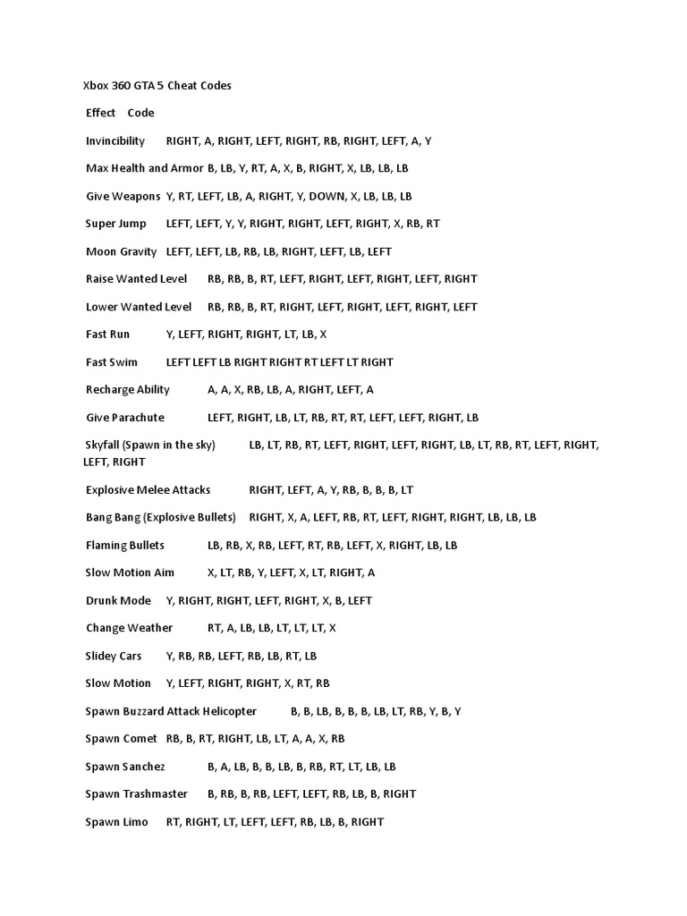Gta 5 Xbox360 Cheat Codes Download Free